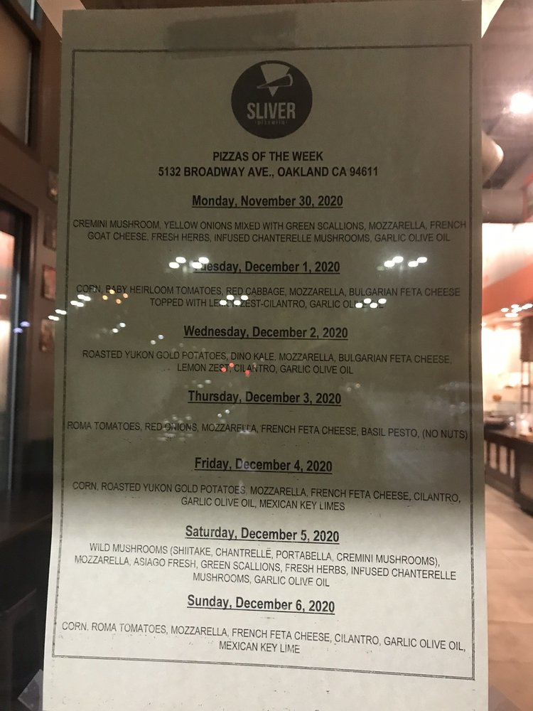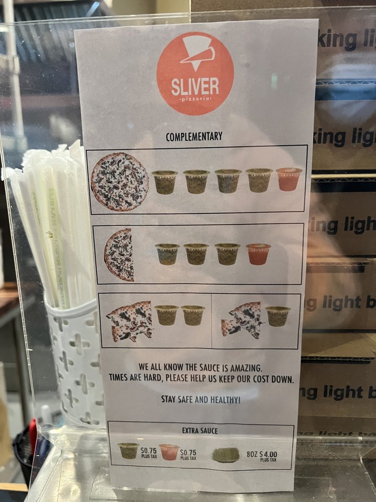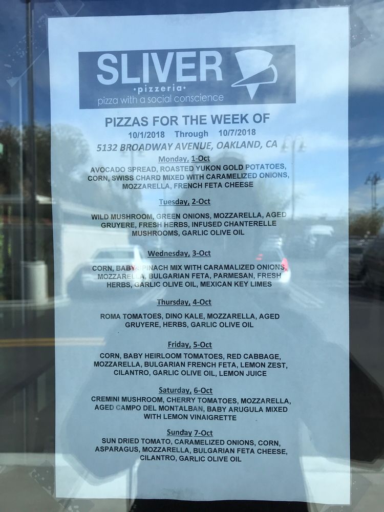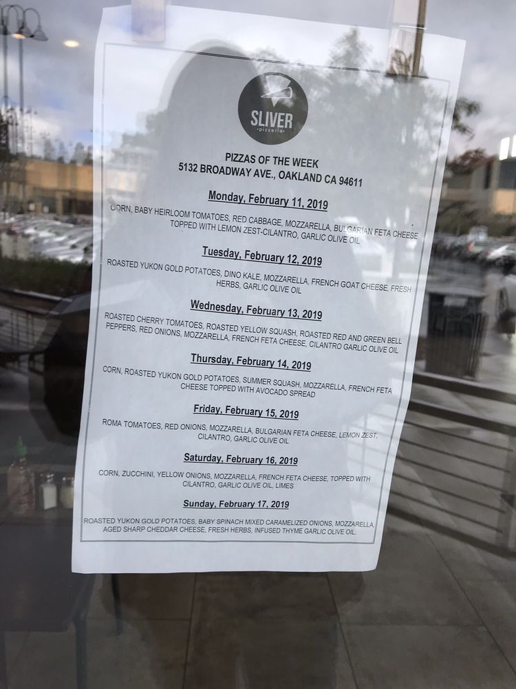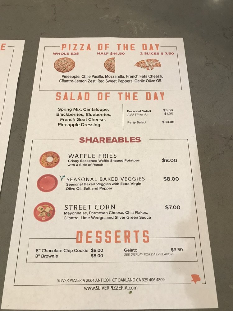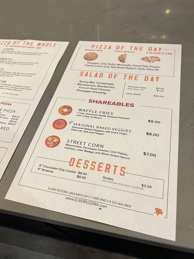 Sliver Pizzeria, located in Oakland, CA, is a must-visit for pizza lovers. The menu includes a variety of options such as the Pizza of the Day, Cheese Pizza, Gluten Free choices, and Vegan offerings. Customers rave about the fresh and mouthwatering pizzas, with some highlighting the unique green sauce that complements the cheese pizza. The restaurant's hipster and casual vibe, along with options for outdoor seating, make it a great spot for groups or families. The staff is friendly and provides fast service, and the overall atmosphere is welcoming. Whether you're in the mood for a slice or a whole pie, Sliver Pizzeria is worth a visit for its delicious pies and tasty salads.
